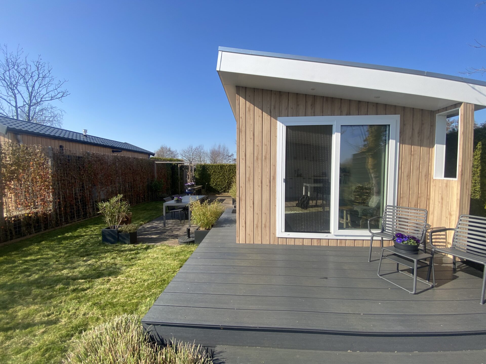 Over de volle lengte van het chalet is een hardhouten terras aangelegd welke