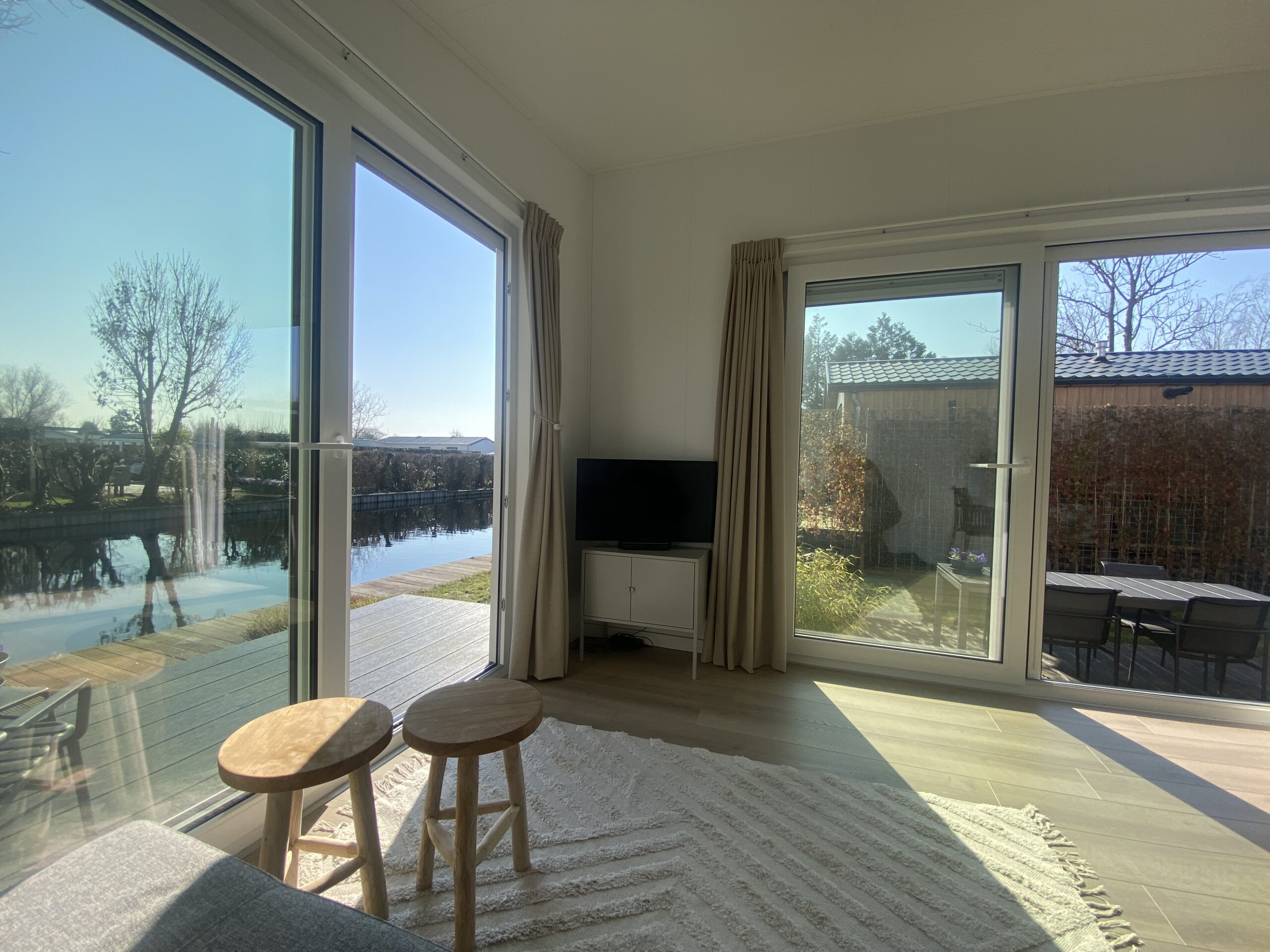 Vanuit het chalet is er geweldig uitzicht op het water en de tuin. Zowel binnen als