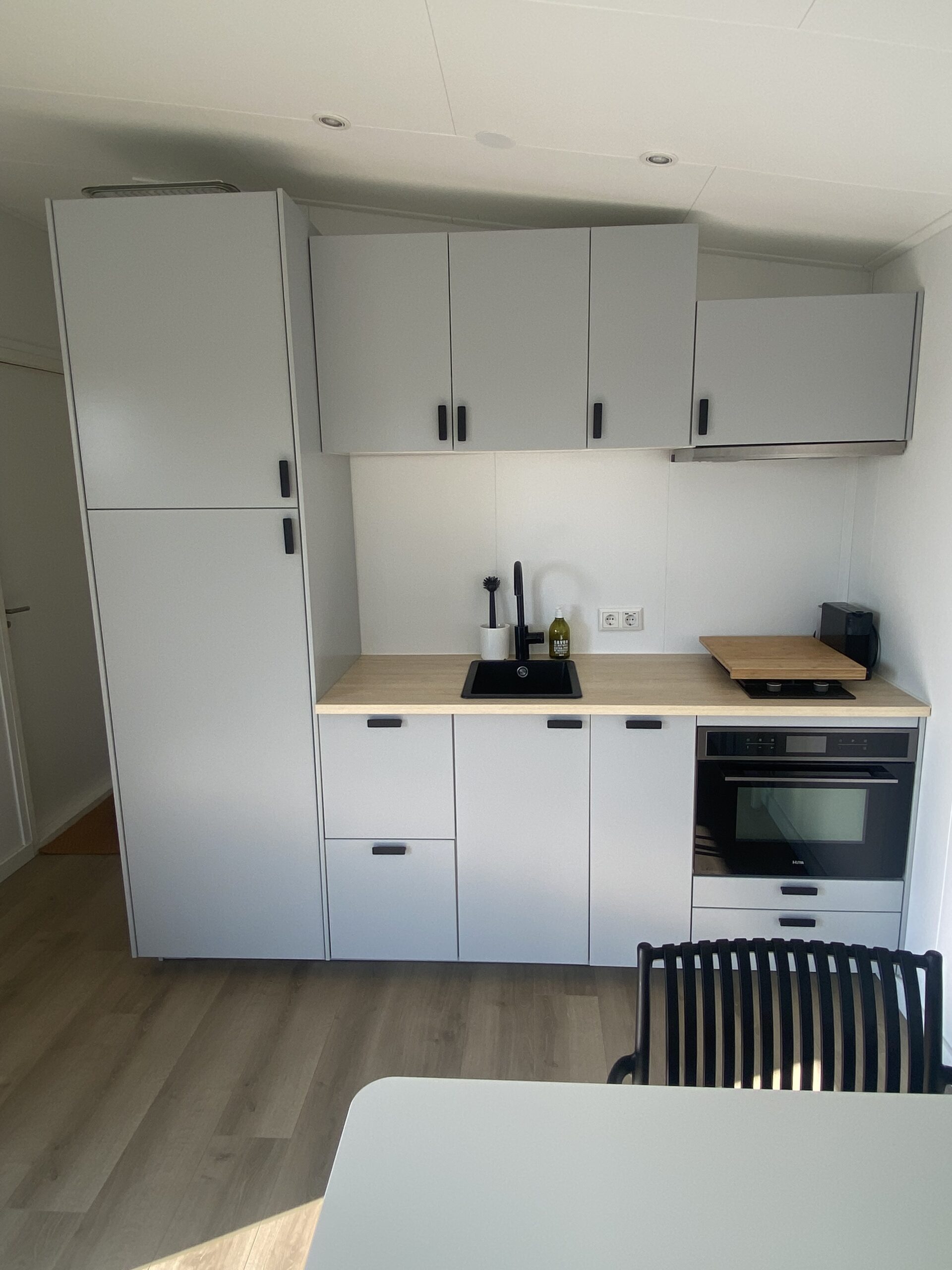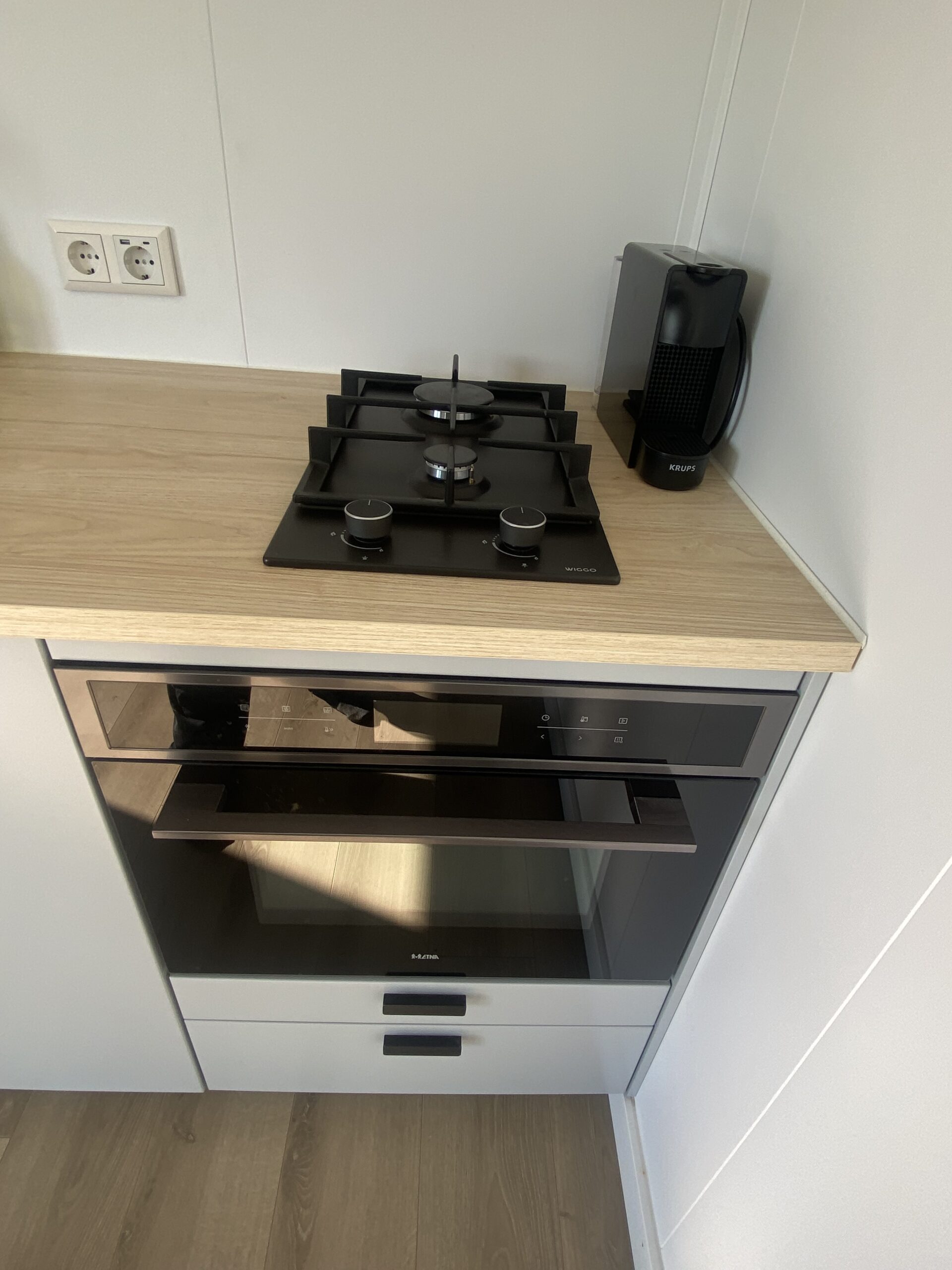 gaskookplaat, spoelbak, combi-oven, waterkoker en Nespresso koffiemachine.