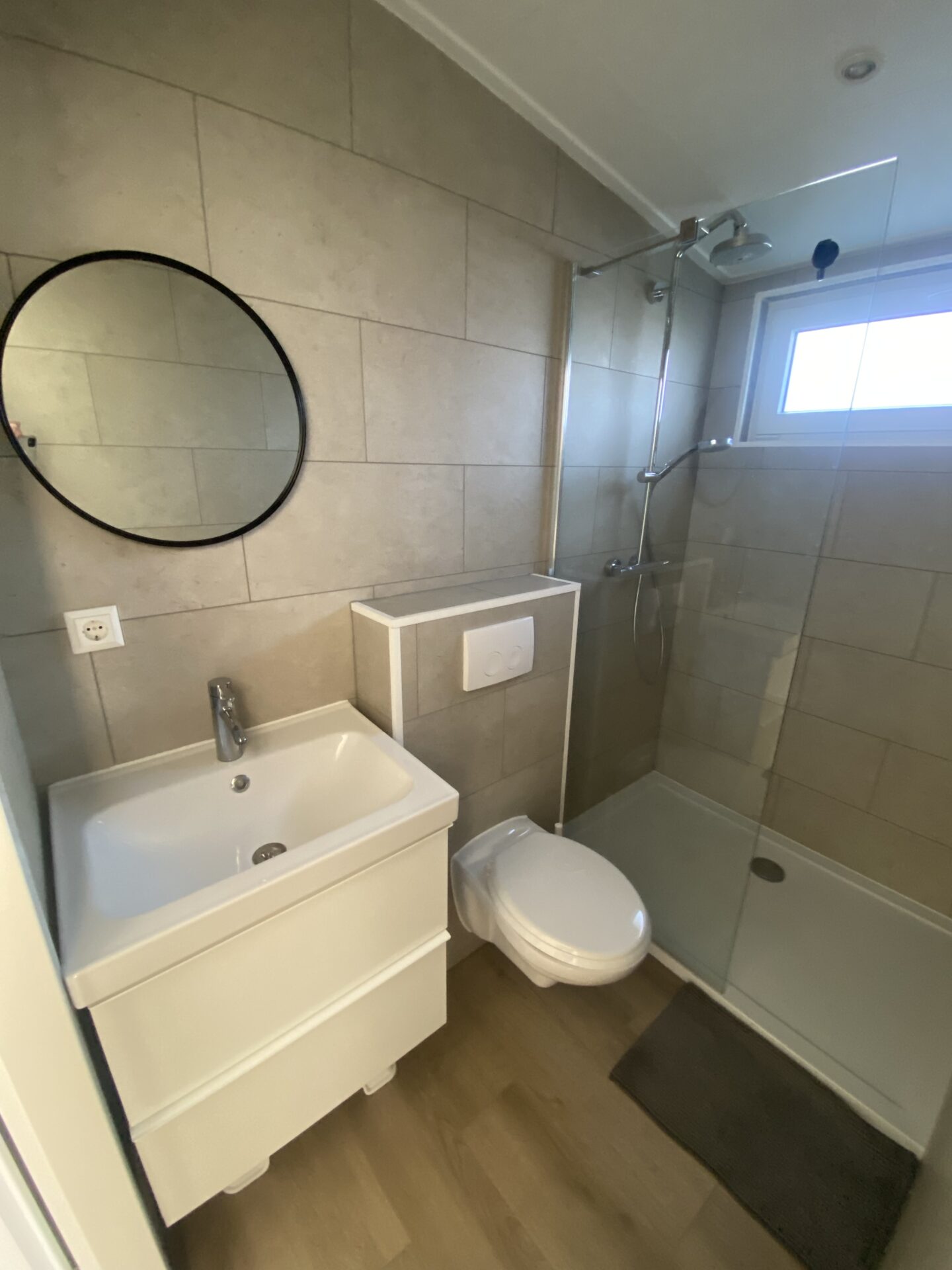 De badkamer is voorzien van een inloopdouche, wastafel en hangend toilet.