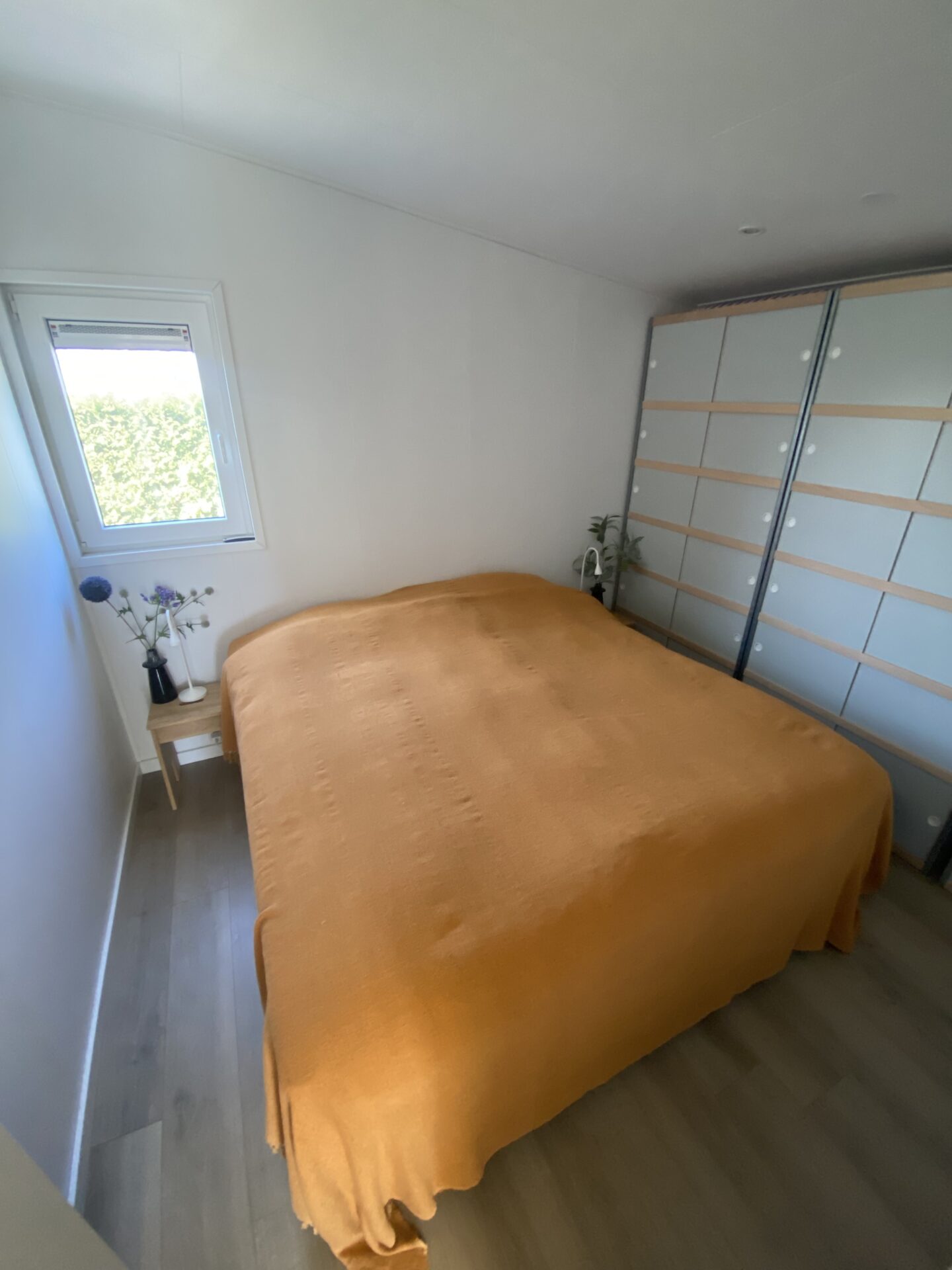 de badkamer en de woonkamer. De slaapkamer is voorzien van een boxspring